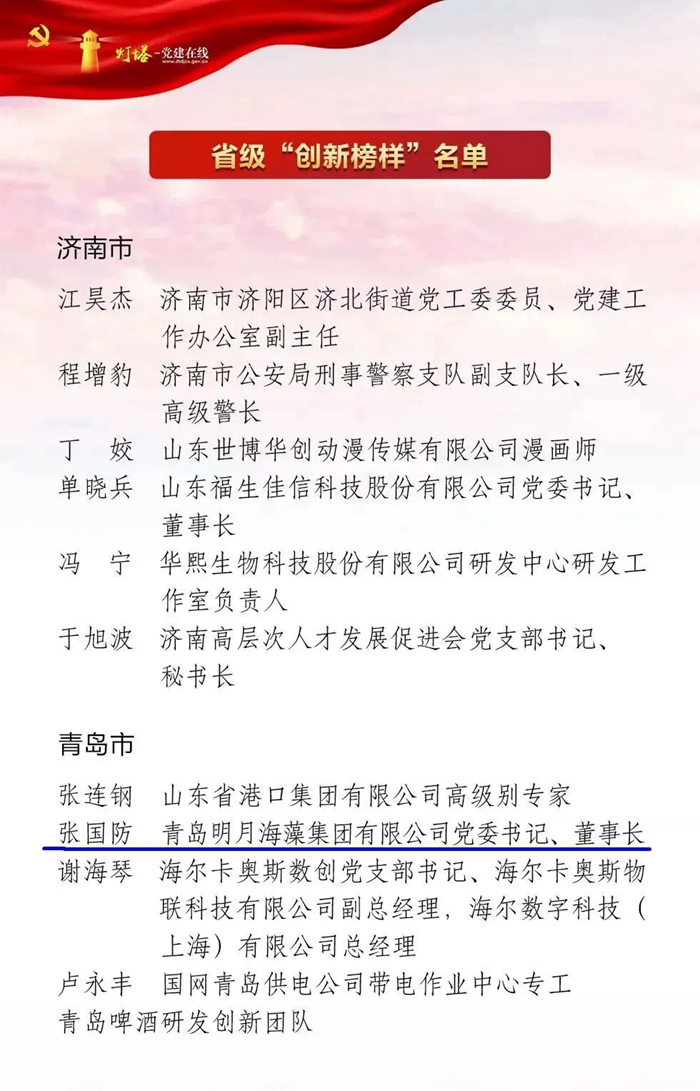 11月24日,省委組織部公布山東省創新榜樣名單,青島明月海藻集團黨委書記、董事局主席張國防光榮上榜。