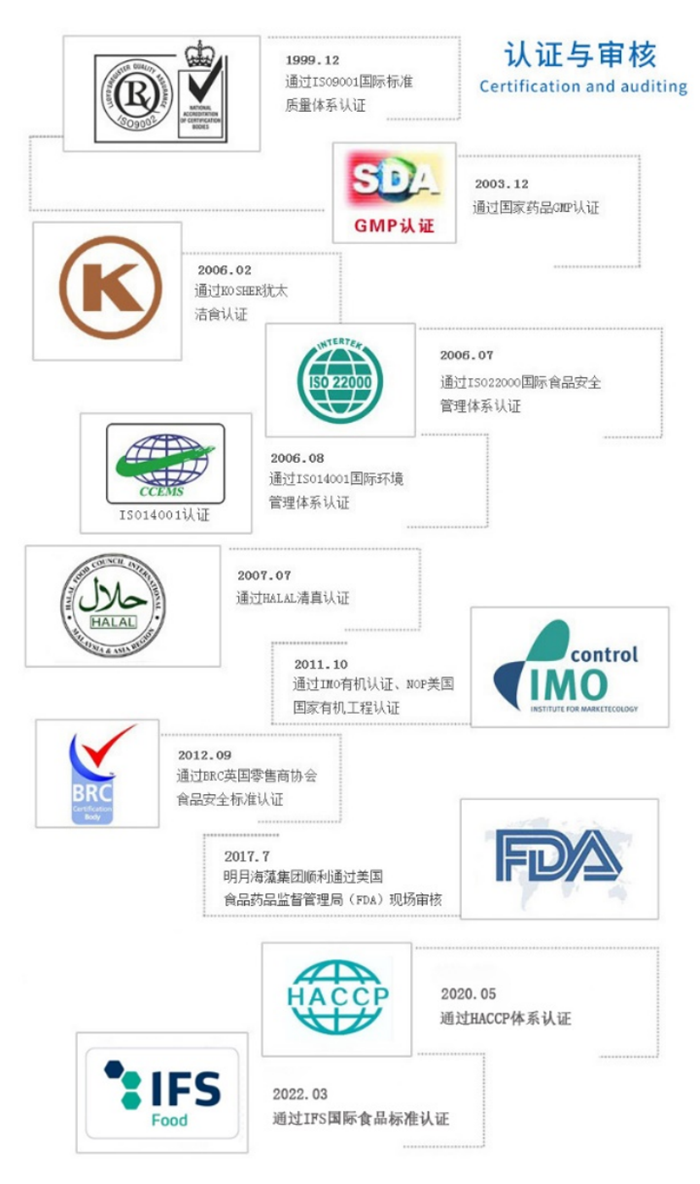 質(zhì)量是企業(yè)的立身之本、發(fā)展之基、信譽(yù)之源。企業(yè)改制25年以來,明月海藻集團(tuán)始終堅持“堅持質(zhì)量至上,滿足顧客期望,確保技術(shù)優(yōu)勢,領(lǐng)先市場競爭”的質(zhì)量方針,建立了一套科學(xué)化、數(shù)字化、網(wǎng)格化的全員質(zhì)量管理體系。公司擁有“青島市首席質(zhì)量官”,擁有高水平的產(chǎn)品質(zhì)量檢測中心,并通過了ISO9001、ISO22000、ISO14001、BRC、GMP、KOSHER、HALAL等系列認(rèn)證。