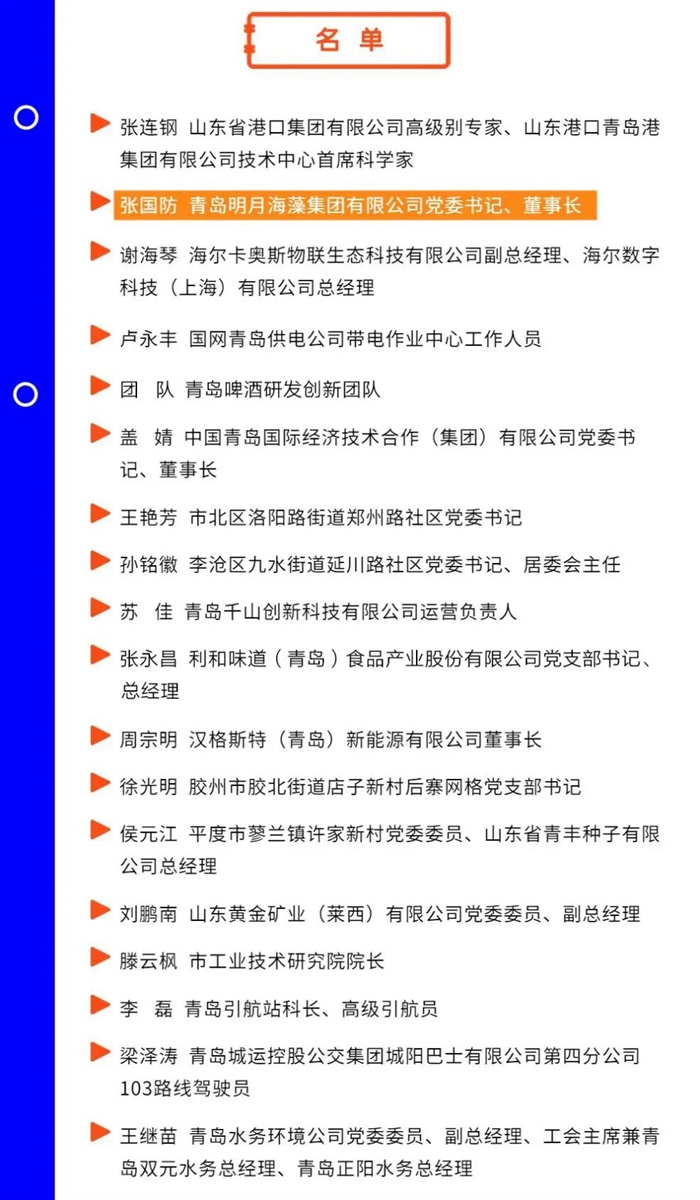 按照省委組織部部署,圍繞“十大創(chuàng)新”工作重點,青島市從4月份啟動了2022年“發(fā)現(xiàn)榜樣”活動,全市擬確定“創(chuàng)新榜樣”團(tuán)隊2個、黨員20名。7月12日,青島市“創(chuàng)新榜樣”名單公示,其中,青島明月海藻集團(tuán)董事局主席張國防入選。